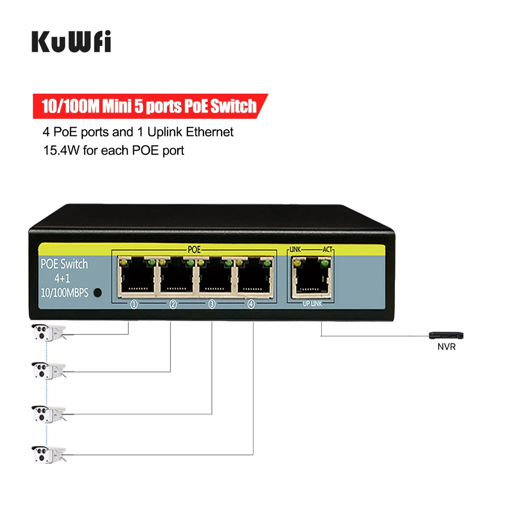 Product Name: 5 Port 10 100Mbps Network Switch 802.3af 52V Switch For Lift IP Camera 4POE Ports and 1 Uplink Ethernet Support Extend 250m