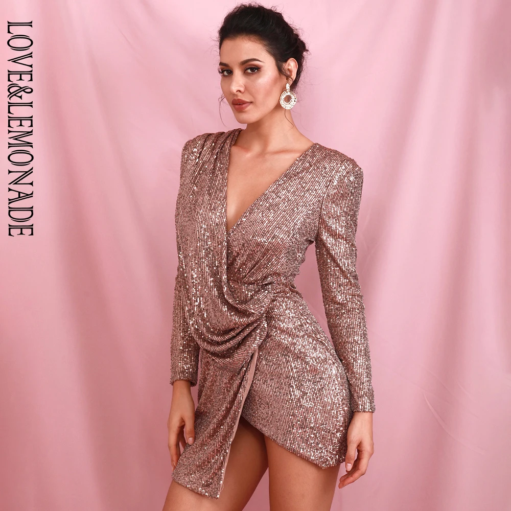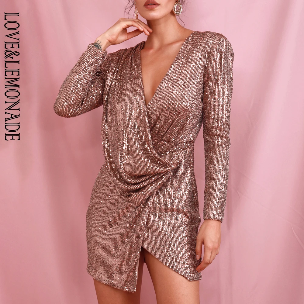 Best . (34% Off) Buy LOVE LEMONADE Sexy Beown Deep V neck Draped Elastic Sequin Cross Bodycon Long Sleeve Party Mini Dress LM82186 LM82186 Price Online.